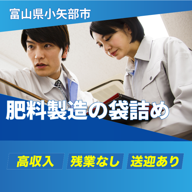 給与詳細 月収例 224,000円 日給例 11,200円 勤務地 富山県小矢部市 仕事内容 【肥料の製造】