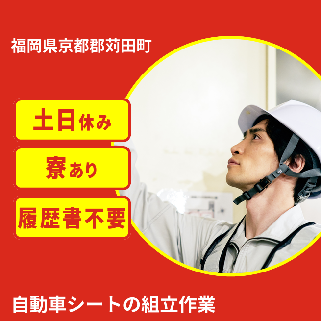 給与詳細 月収例 240,000円 日給例 12,000円 勤務地 福岡県京都郡苅田町 仕事内容 【自動車シートの組み立て】