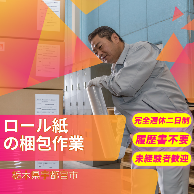 給与詳細 月収例 250,000円 日給例 12,500円 勤務地 栃木県宇都宮市 仕事内容 ロール紙の梱包作業。大小さまざまなロール紙を緩衝材やラップなどを使用し梱包する作業です。