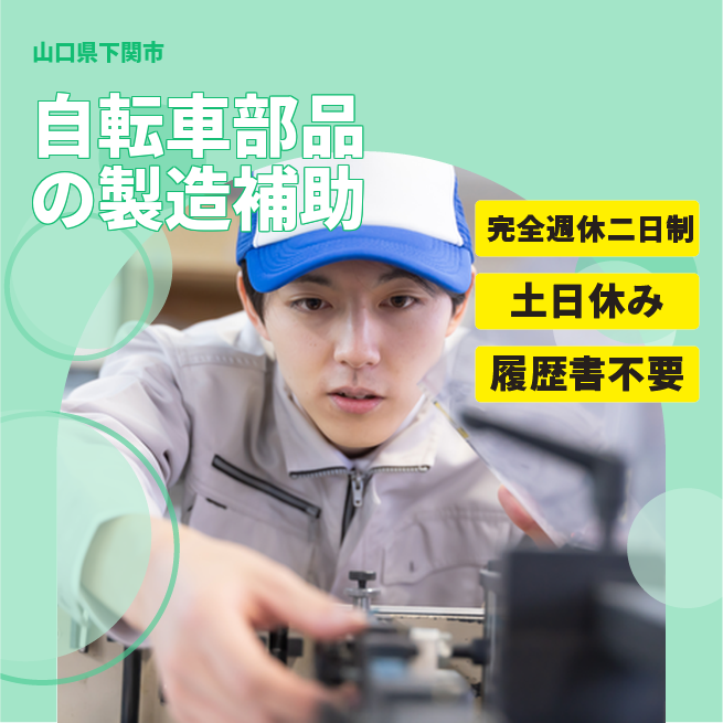 給与詳細 月収例 200,000円 日給例 10,000円 勤務地 山口県下関市 仕事内容 \【未経験歓迎】自転車部品の製造補助スタッフ募集/