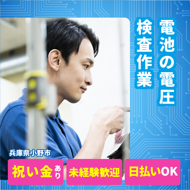 給与詳細 月収例 249,123円 日給例 10,000円 勤務地 兵庫県小野市 仕事内容 耐熱検査する工程でのコイン型電池の電圧検査するお仕事