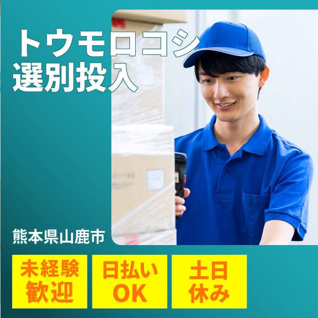給与詳細 月収例 210,000円 時給例 1,200円 勤務地 熊本県山鹿市 仕事内容 【トウモロコシの選別・投入】