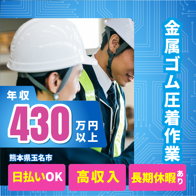 ◆日払い・仮払いOK(アプリでカンタン申請!) 交通費 支給あり 応募の流れ 本ページ内<応募する>ボタンより、必要項目をご入力の上、ご応募ください。 勤務地 【勤務地】熊本県玉名市河崎 勤務時間 【勤務地】8:15~16:35(休憩60分)