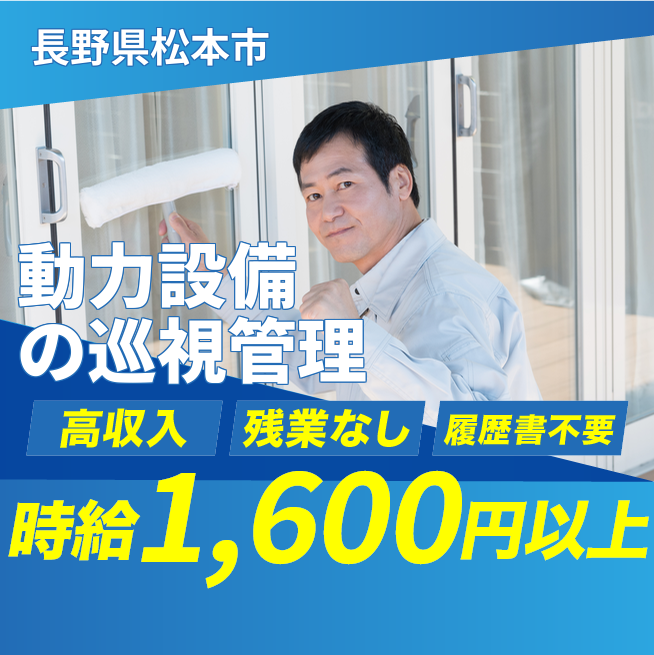 給与詳細 月収例 256,000円 時給例 1,600円 勤務地 長野県松本市 仕事内容 製造現場を巡視・管理しながら、動力(電気・用水・用排水)部門全般