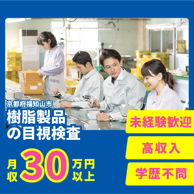 給与詳細 月収例 310,000円 日給例 12,000円 勤務地 京都府福知山市 仕事内容 【樹脂製品の検査(2交替)】