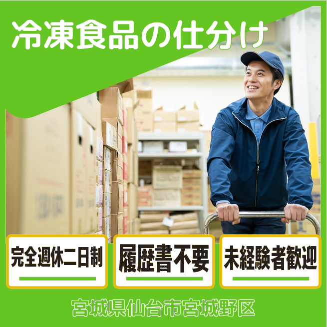 給与詳細 月収例 230,000円 日給例 11,500円 勤務地 宮城県仙台市宮城野区 仕事内容 冷凍食品、アイスクリームの仕分け、ピッキング業務!