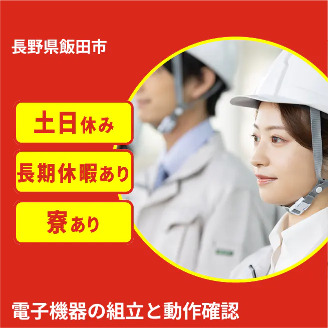 ■組立だけでなく動作確認や品質チェックまで担当できる 寮・社宅 寮あり(有料) 求人番号 113881-1Cz 給与詳細 月収例 205,000円 日給例 10,250円 交通費 支給あり 応募の流れ 本ページ内<応募する>ボタンより、必要項目をご入力の上、ご応募ください。 勤務地 【勤務地】長野県飯田市大休 勤務時間 【勤務地】日勤8:30~17:15