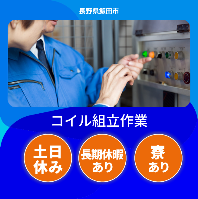 給与詳細 月収例 251,250円 日給例 12,562円 勤務地 長野県飯田市 仕事内容 【業務内容】
