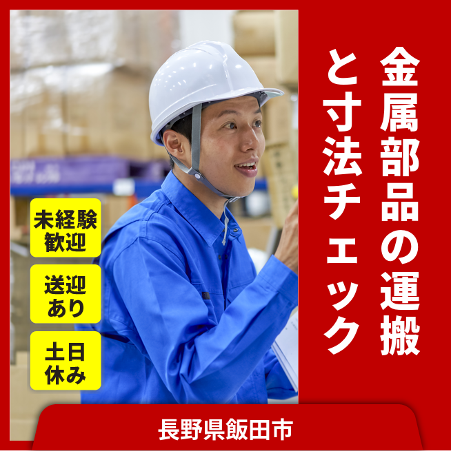 ■重いものを持つ作業がなく取り組みやすい 寮・社宅 寮あり(有料) 求人番号 113887-1Cz 給与詳細 月収例 237,250円 日給例 11,862円 交通費 支給あり 応募の流れ 本ページ内<応募する>ボタンより、必要項目をご入力の上、ご応募ください。 勤務地 【勤務地】長野県飯田市大休 勤務時間 【勤務地】日勤8:30~17:30