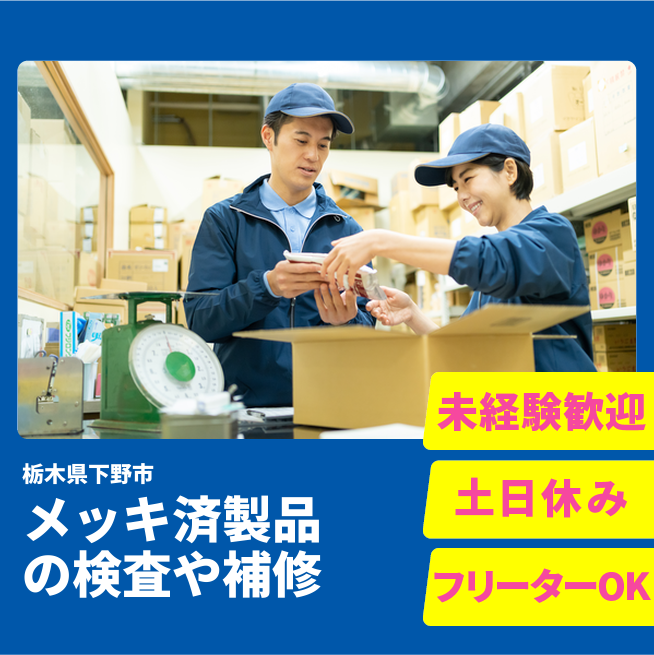 金属製品のメッキ加工を行っている工場で、メッキ済製品の検査や補修をご担当いただきます。