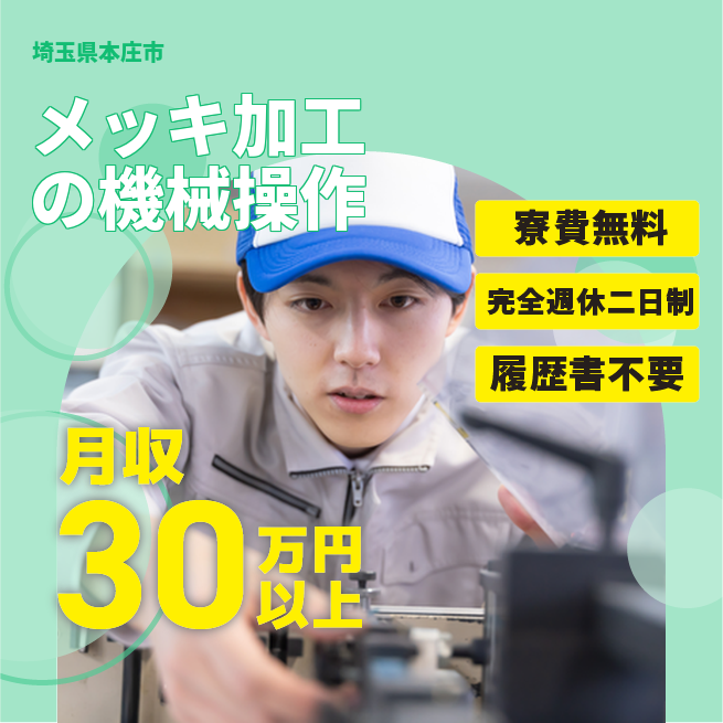 給与詳細 月収例 331,500円 時給例 1,700円 勤務地 埼玉県本庄市 仕事内容 自動車等のメッキ加工業務、マシンオペレーター業務