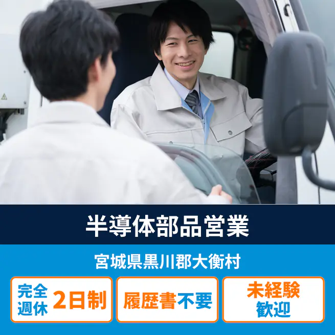 給与詳細 月収例 273,000円 日給例 11,200円 勤務地 宮城県黒川郡大衡村 仕事内容 半導体用金属部品企業様でのルート営業のお仕事です。
