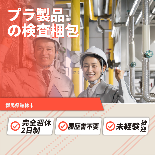 給与詳細 月収例 160,000円 時給例 1,200円 勤務地 群馬県館林市 仕事内容 ≪製品の検査・梱包≫