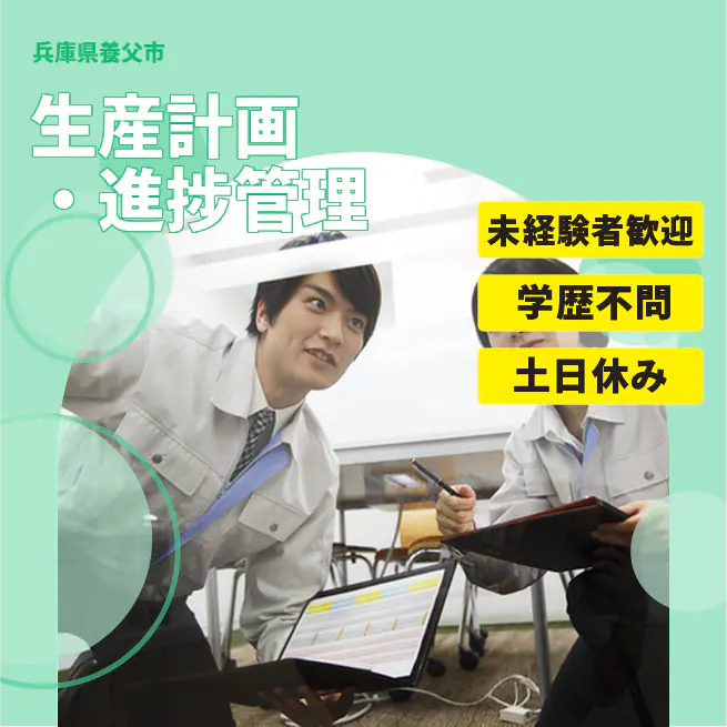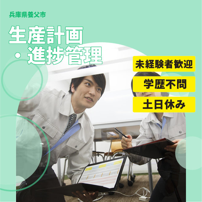 給与詳細 月収例 261,225円 日給例 10,800円 勤務地 兵庫県養父市 仕事内容 ①営業からオーダーがあったものに関して生産計画→進捗確認→進捗フォローや外注先のフォローなどの補助作業