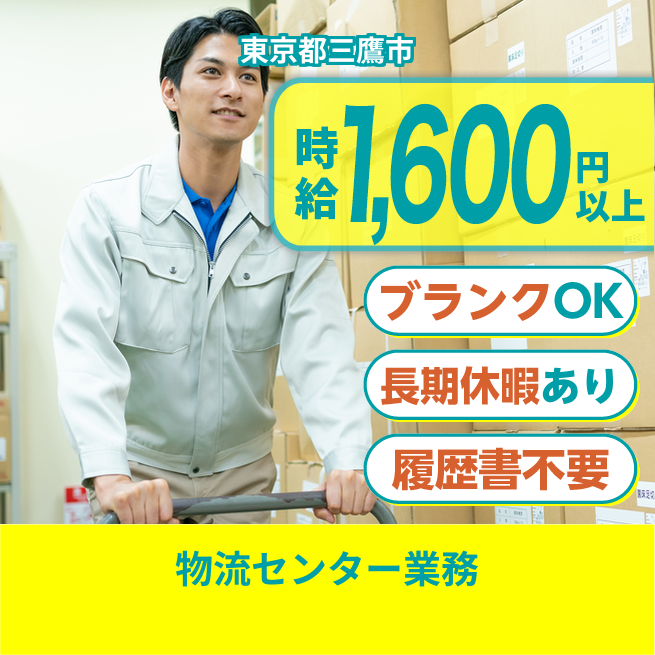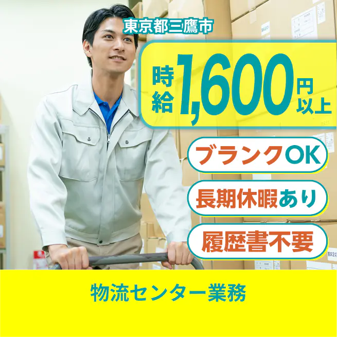時給例:1688円 応募の流れ 本ページ内<応募する>ボタンより、必要項目をご入力の上、ご応募ください。 勤務地 【勤務地】東京都三鷹市牟礼 勤務時間 【勤務地】9:00~18:00