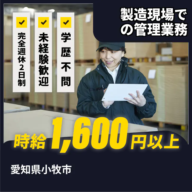 企業 株式会社バイトレ 給与詳細 月収例 256,000円 時給例 1,600円 勤務地 愛知県小牧市 仕事内容 【業務概要】