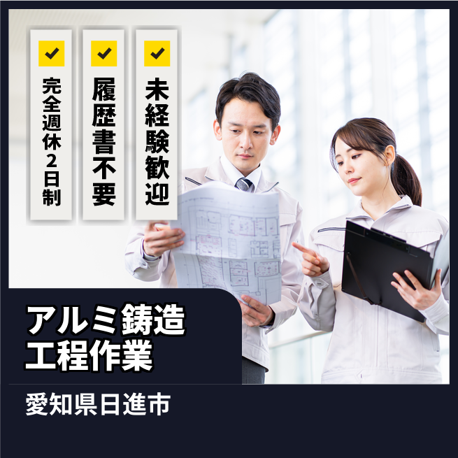 給与詳細 月収例 240,000円 日給例 12,000円 勤務地 愛知県日進市 仕事内容 鋳造工程での各種作業 FVB注湯・造型・取出工程作業及びその付帯業務