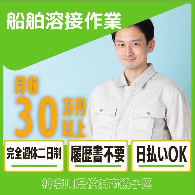 (20日勤務、残業20時間、休出1日の場合) 交通費 支給あり 応募の流れ 本ページ内<応募する>ボタンより、必要項目をご入力の上、ご応募ください。 勤務地 【勤務地】神奈川県横浜市磯子区新杉田町 勤務時間 【勤務地】8:00~17:00(休憩60分 実働8時間) 必須資格 溶接作業の経験のある方