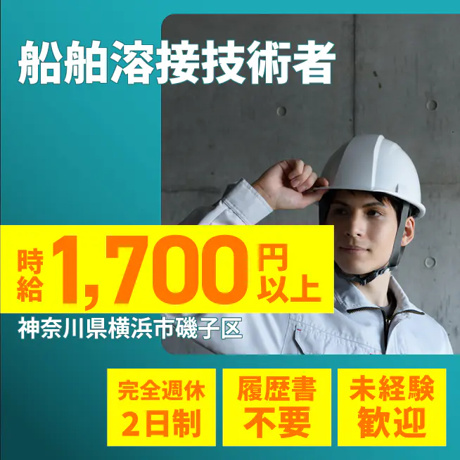 (20日勤務、残業20時間、休出1日の場合) 交通費 支給あり 応募の流れ 本ページ内<応募する>ボタンより、必要項目をご入力の上、ご応募ください。 勤務地 【勤務地】神奈川県横浜市磯子区新杉田町 勤務時間 【勤務地】8:00~17:00(休憩60分 実働8時間) 必須資格 未経験でこれから溶接スキルを身に付けて仕事をしたい方、大募集です!