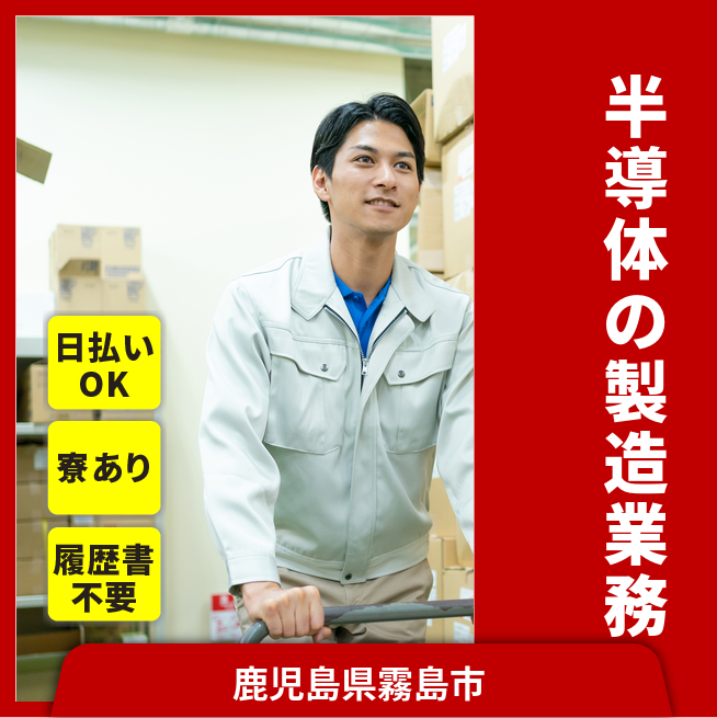 給与詳細 月収例 219,000円 時給例 1,031円 勤務地 鹿児島県霧島市 仕事内容 半導体製造