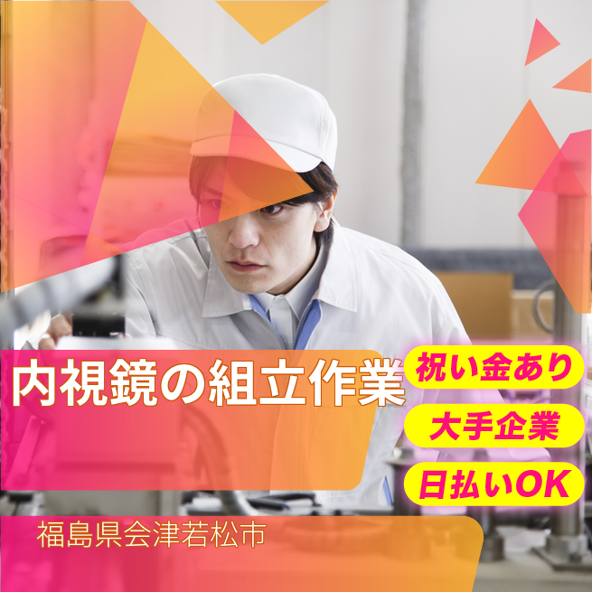 給与詳細 月収例 231,000円 日給例 10,800円 勤務地 福島県会津若松市 仕事内容 医療用内視鏡を組立するお仕事です。