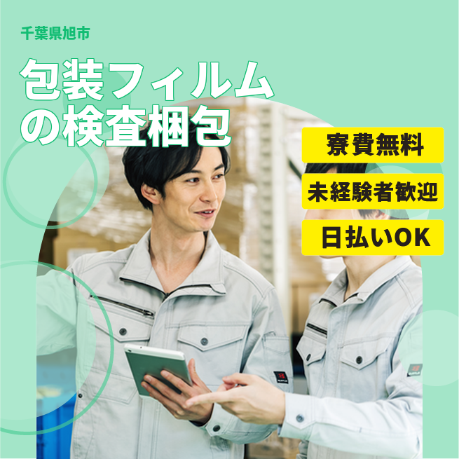 給与詳細 月収例 262,000円 日給例 10,400円 勤務地 千葉県旭市 仕事内容 【製袋工程】カットされた1枚ごとの包装フィルムを目視検査し束ねてダンボールに梱包する作業。♦簡単なPC入力作業あり
