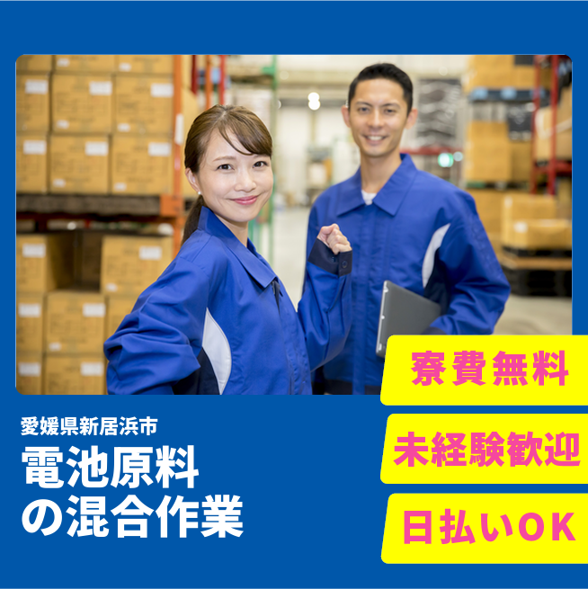 給与詳細 月収例 283,000円 日給例 11,600円 勤務地 愛媛県新居浜市 仕事内容 電池の原材料の混合・投入・梱包・運搬