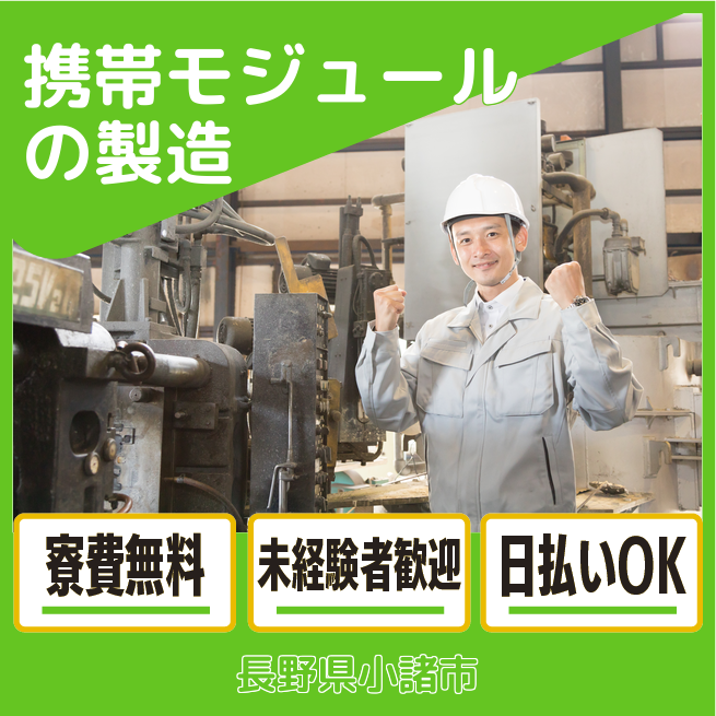 給与詳細 月収例 294,000円 日給例 10,000円 勤務地 長野県小諸市 仕事内容 携帯電話に使用するモジュールの製造業務