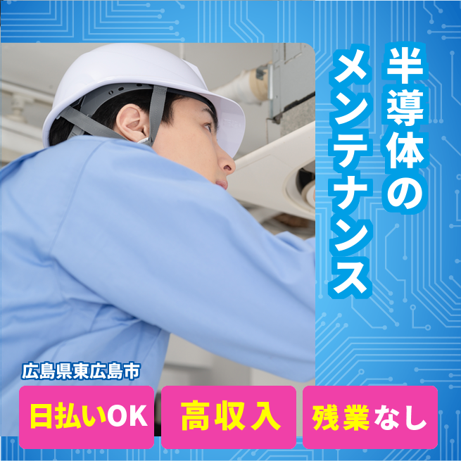 給与詳細 月収例 265,000円 日給例 11,500円 勤務地 広島県東広島市 仕事内容 半導体メンテナンス業務・パソコン使用・クリーンルーム内作業