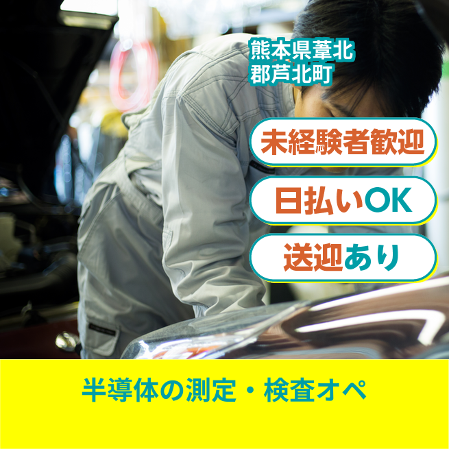 給与詳細 月収例 192,000円 時給例 1,200円 勤務地 熊本県葦北郡芦北町 仕事内容 半導体製品の測定・検査装置のオペレーション業務及びそれに付随する業務