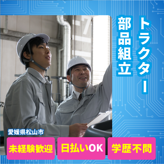 給与詳細 月収例 196,000円 時給例 1,100円 勤務地 愛媛県松山市 仕事内容 農業用トラクター製造
