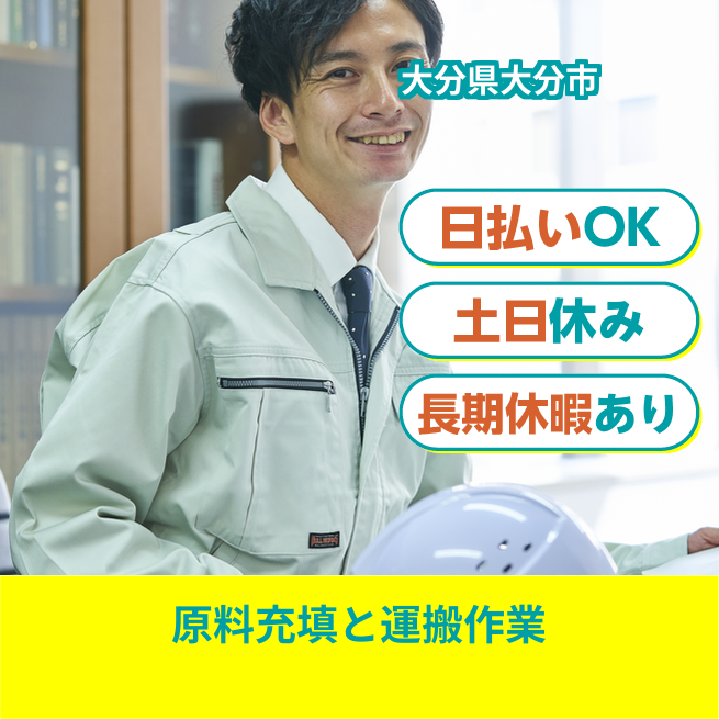 給与詳細 月収例 230,000円 日給例 10,400円 勤務地 大分県大分市 仕事内容 物流運搬作業原料をドラム缶へ充填、ほか運搬作業補助