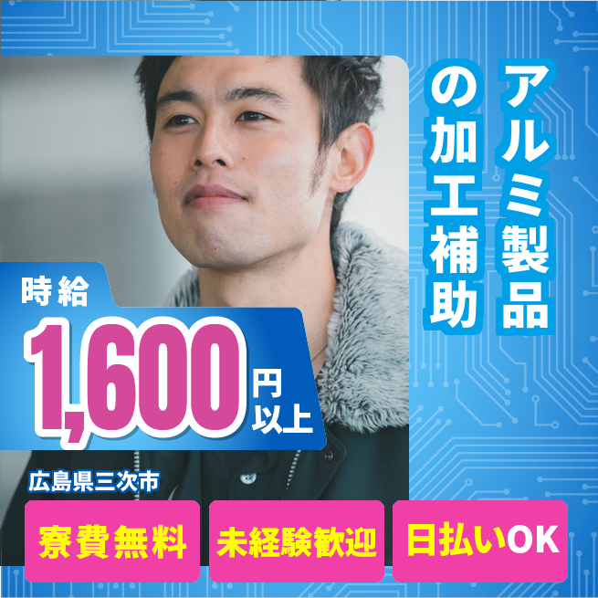 給与詳細 月収例 298,000円 時給例 1,600円 勤務地 広島県三次市 仕事内容 金属アルミ製品の機械加工(鋳造工程補助作業)