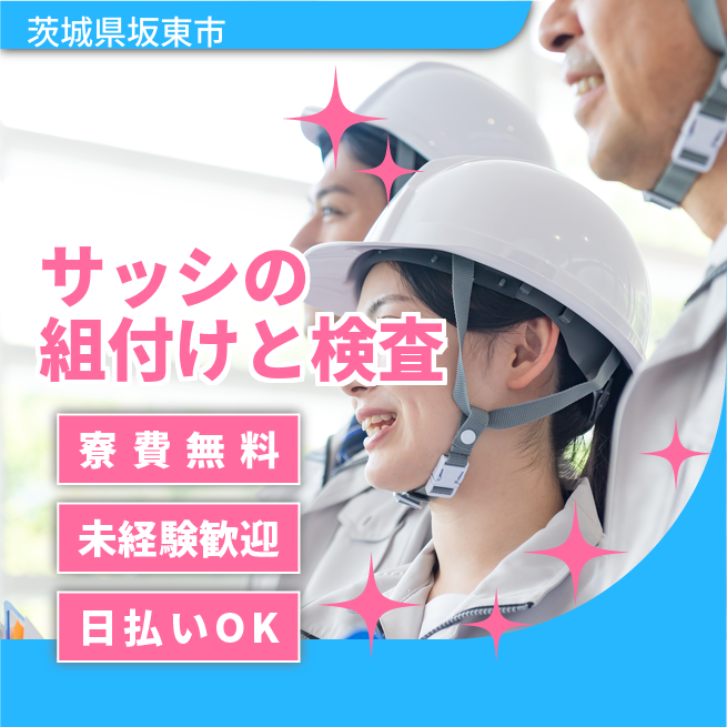 給与詳細 月収例 257,000円 日給例 10,400円 勤務地 茨城県坂東市 仕事内容 住宅用アルミ・樹脂サッシの製造(切断・加工・組付・梱包)