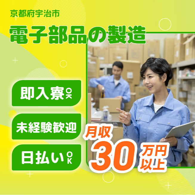 給与詳細 月収例 306,000円 日給例 10,400円 勤務地 京都府宇治市 仕事内容 電子部品製造