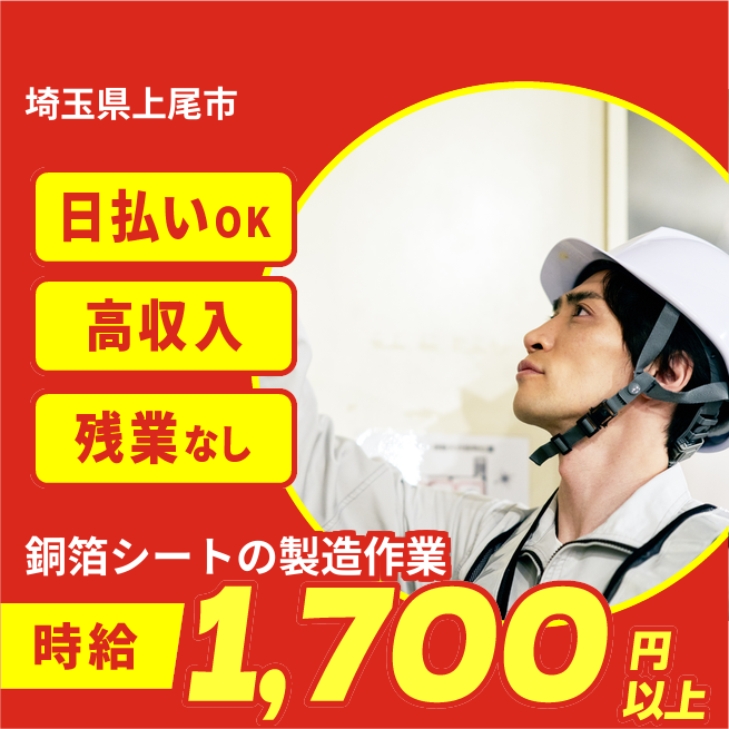 給与詳細 月収例 295,000円 時給例 1,718円 勤務地 埼玉県上尾市 仕事内容 銅箔シートの製造・室内でのお仕事(マシンOP)