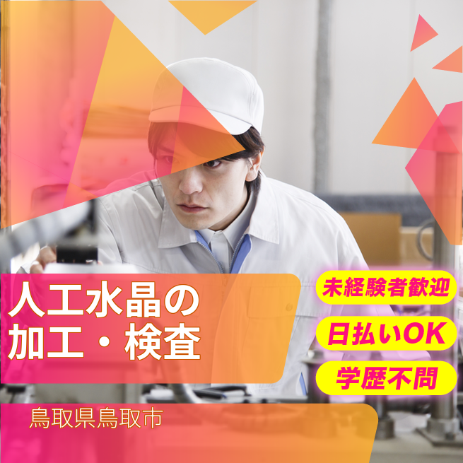 給与詳細 月収例 208,000円 時給例 1,140円 勤務地 鳥取県鳥取市 仕事内容 ・マシンオペレーターとして、人工水晶を使用した半導体部品の製造・