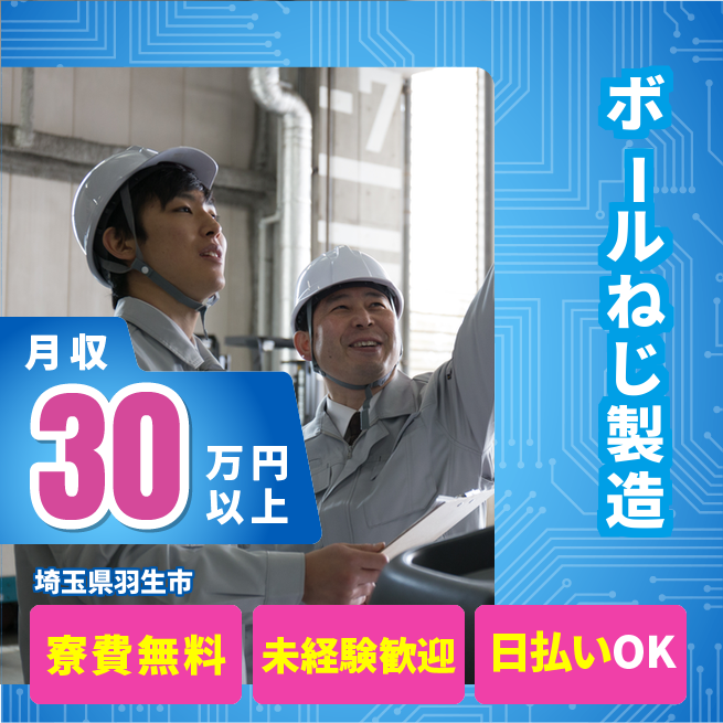 給与詳細 月収例 311,000円 日給例 12,400円 勤務地 埼玉県羽生市 仕事内容 【業務内容】