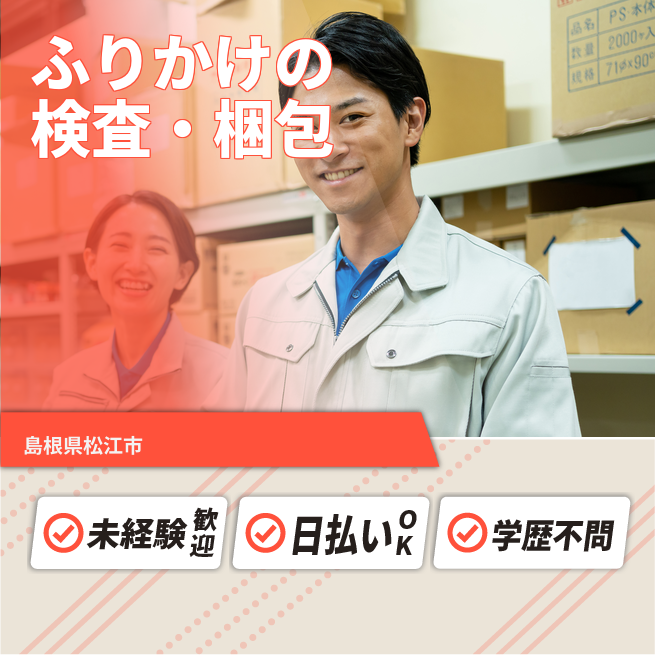 給与詳細 月収例 210,000円 時給例 1,090円 勤務地 島根県松江市 仕事内容 ふりかけ等の具材検査・梱包業務