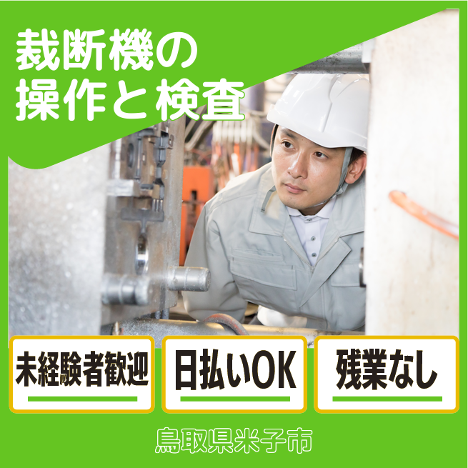 給与詳細 月収例 189,000円 時給例 1,125円 勤務地 鳥取県米子市 仕事内容 ●裁断機オペレーター業務