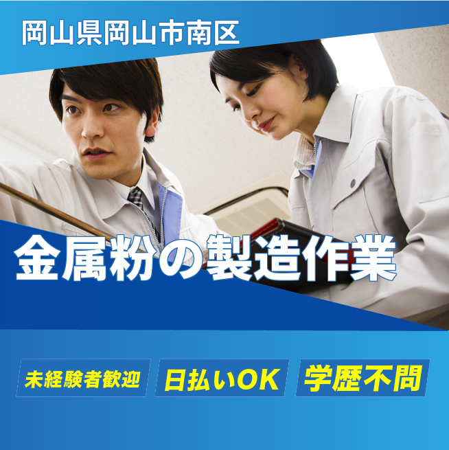 給与詳細 月収例 252,000円 日給例 10,400円 勤務地 岡山県岡山市南区 仕事内容 金属粉の製造に関わるお仕事