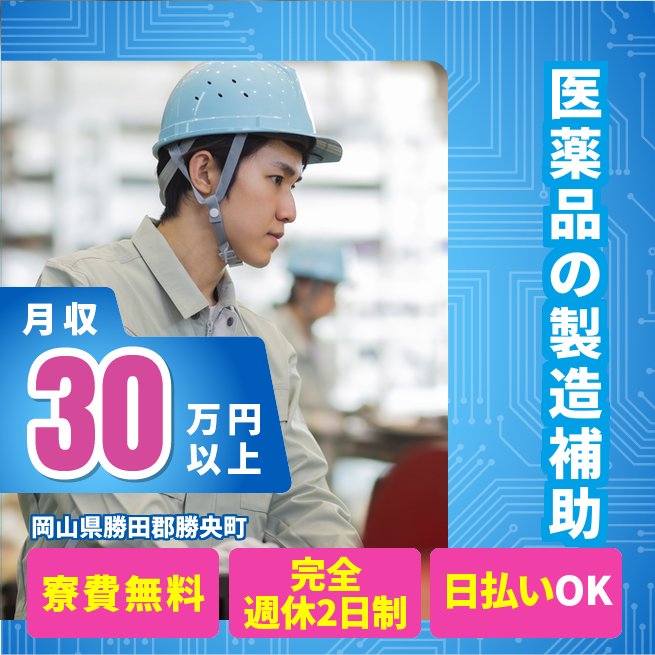 給与詳細 月収例 328,000円 時給例 1,600円 勤務地 岡山県勝田郡勝央町 仕事内容 ジェネリック医薬品の製造工場