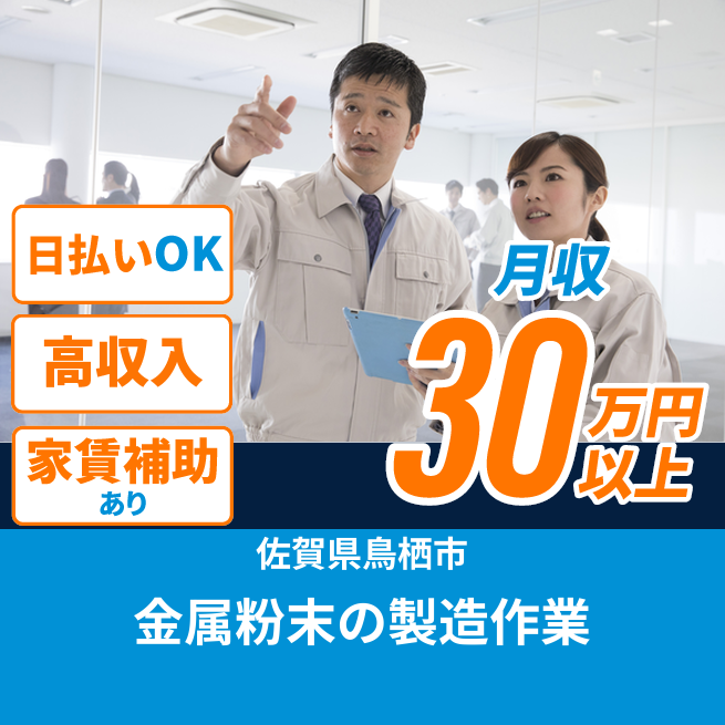 給与詳細 月収例 330,000円 日給例 12,000円 勤務地 佐賀県鳥栖市 仕事内容 金属粉末・金属ペースト製造