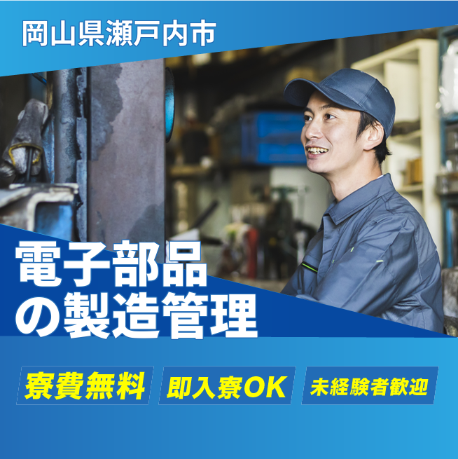 給与詳細 月収例 284,000円 日給例 10,400円 勤務地 岡山県瀬戸内市 仕事内容 電子部品製造工場での機械オペレーター・検査・運搬・品質管理業務