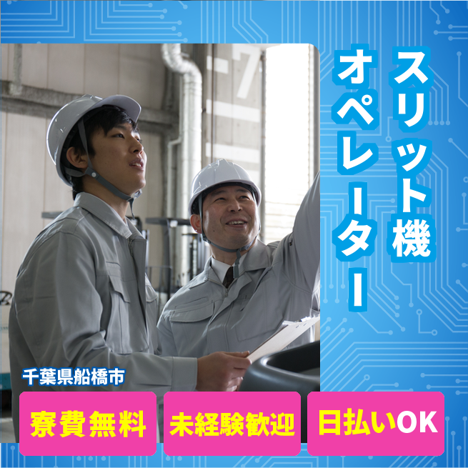 給与詳細 月収例 269,000円 時給例 1,200円 勤務地 千葉県船橋市 仕事内容 【業務内容】スリット工程での包装フィルム加工と梱包