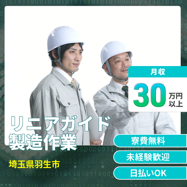 給与詳細 月収例 300,000円 日給例 12,000円 勤務地 埼玉県羽生市 仕事内容 リニアガイド」と呼ばれる、半導体装置に使われる「部品」の製造
