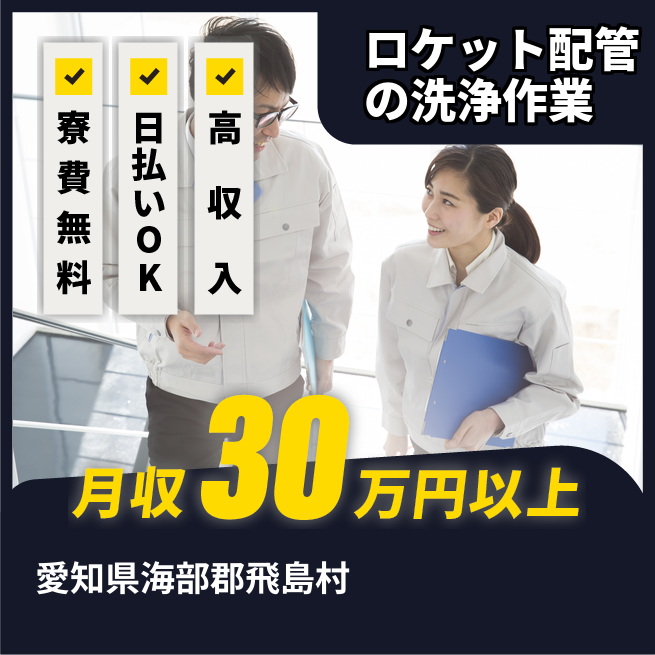 給与詳細 月収例 325,000円 時給例 1,650円 勤務地 愛知県海部郡飛島村 仕事内容 ロケットの配管の洗浄や断熱、耐圧試験作業