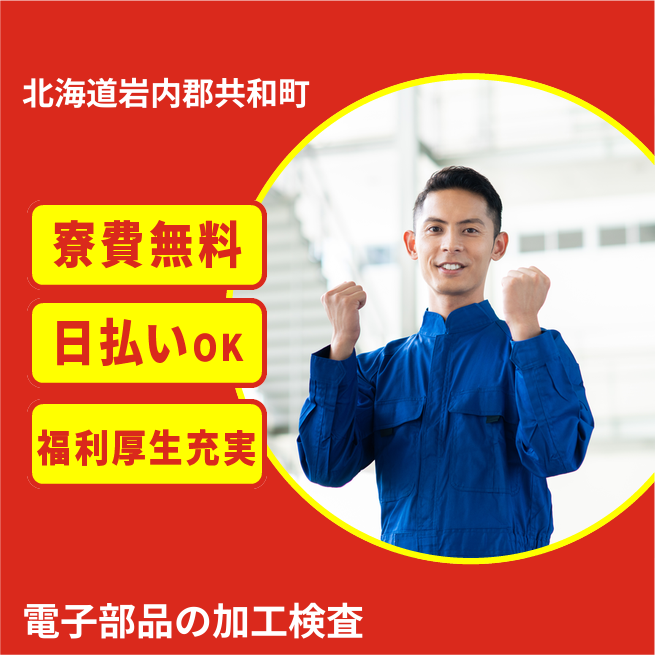 給与詳細 月収例 259,000円 日給例 10,000円 勤務地 北海道岩内郡共和町 仕事内容 電子部品材料加工及び検査の業務