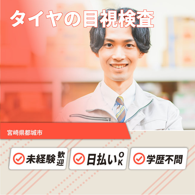 給与詳細 月収例 215,000円 日給例 10,400円 勤務地 宮崎県都城市 仕事内容 タイヤの目視検査