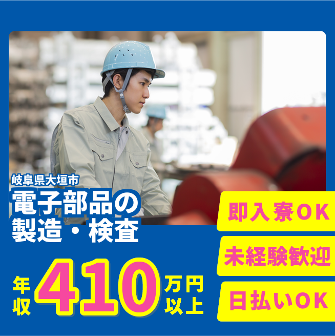 給与詳細 年収例 4,176,000円 月収例 348,000円 勤務地 岐阜県大垣市 仕事内容 電子部品の製造オペレーター、検査などの業務。簡単なPC業務もあり